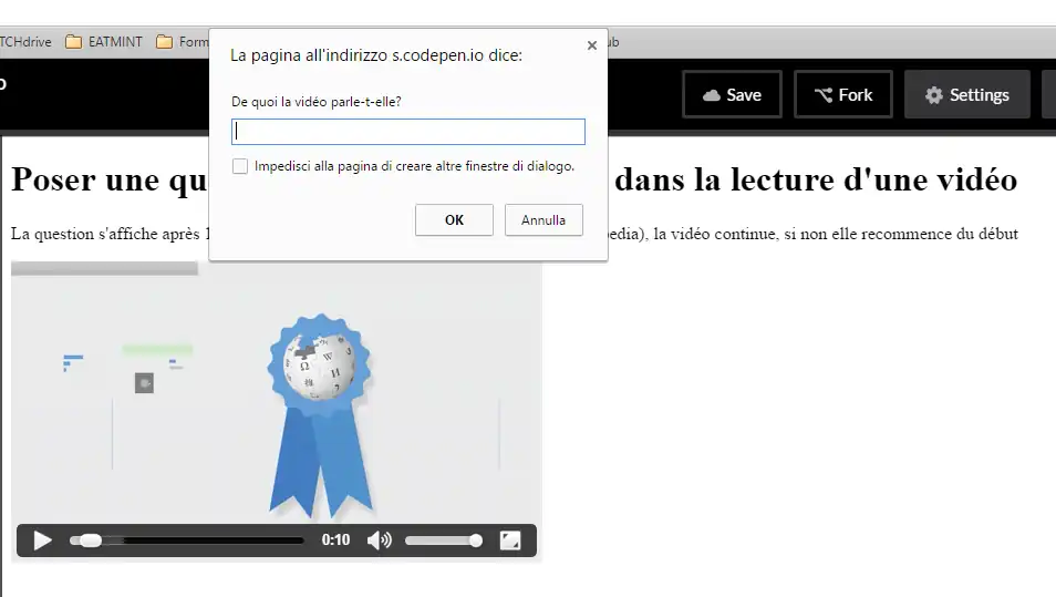 In this example, we will display a question (using the JavaScript prompt() ) after 10 seconds of playing the video. If the user answers the question correctly, the video will resume normally, otherwise it will resume from the beginning. Here is the result in an image: