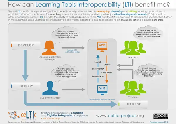 “Learning Tools Interoperability (LTI)™ is a specification developed by IMS Global Learning Consortium. The principal concept of LTI is to establish a standard way of integrating rich learning applications (often remotely hosted and provided through third-party services) with platforms like learning management systems, portals, or other educational environments. In LTI these learning applications are called Tools (delivered by Tool Providers) and the LMS, or platforms, are called Tool Consumers.” (What is Learning Tools Interoperability™? (IMS, retrieved 4/2013)