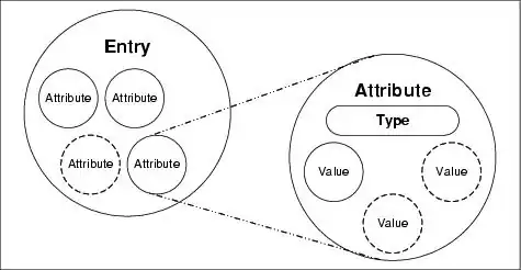 - Entries are instances of ObjectClasses (at least one), i.e. definitions of required or optional attributes So attributes are members of object classes.