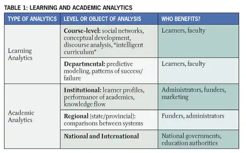 - Large scale analytics (also called academic analytics) whose function is to improve institutions or even whole educational systems.