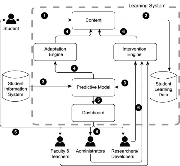 Below is a figure explaining how adaptive learning systems should work. Other scenarios are discussed in the report and we singled this one out, because adaptive learning systems never had any success since they do not fit into either constructivist or direct instructional design models. Note the relative absence of the learner. In the picture the student is just directed to look at contents ...