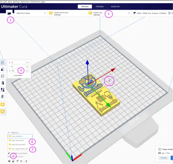 - Select Lego compatible block(s) and assign to left extruder (little vertical bar to the left)