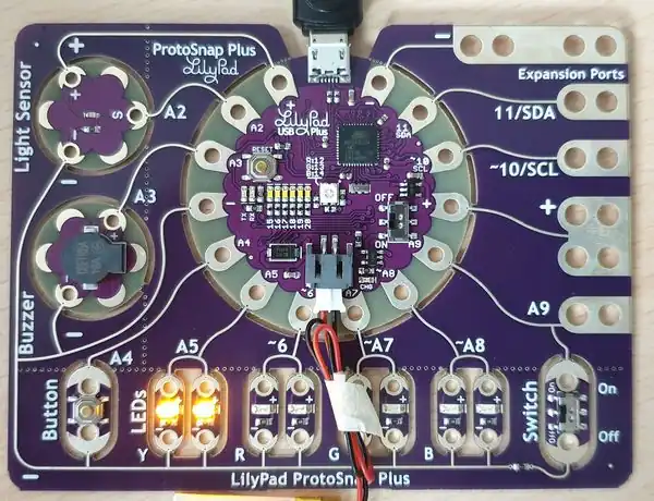 | 2x LilyPad Y LEDs (+) | A5 | A pair of yellow LEDs controlled by LilyPad USB Plus. |