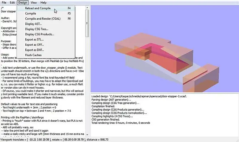 - Use menu: Reload and compile or F4. If you prefer using an external editor for editing .scad code, the program will detect change of file date and automatically reload. I use emacs in order to get "real" indentation support and good syntax high-lighting).