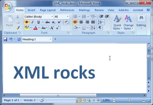 Let's a look at very short Word 2007 document. It only contains a level 1 heading with two words and a font change. The file is called XML_rocks.docx