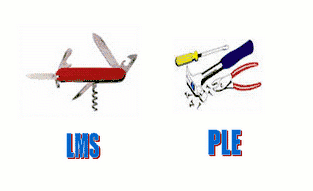 The difference between an LMS and a PLE in the sense of a learner's open tool collection is nicely illustrated by this picture from Mohamed Amine Chatti who argues that “Rather than integrating different tools into a centralized system, the idea is to provide the learner with a myriad of tools and hand over control to her to select, combine and use the tools the way she deems fit.”.