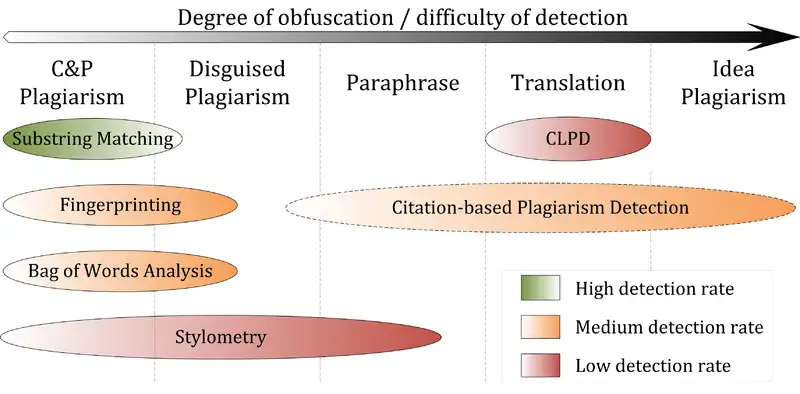 Wikipedia's plagiarism detection article (retrieved 6/2016)includes a picture made in 2011 by an anonymous author that summarizes methods and performance of plagiarism detection systems: