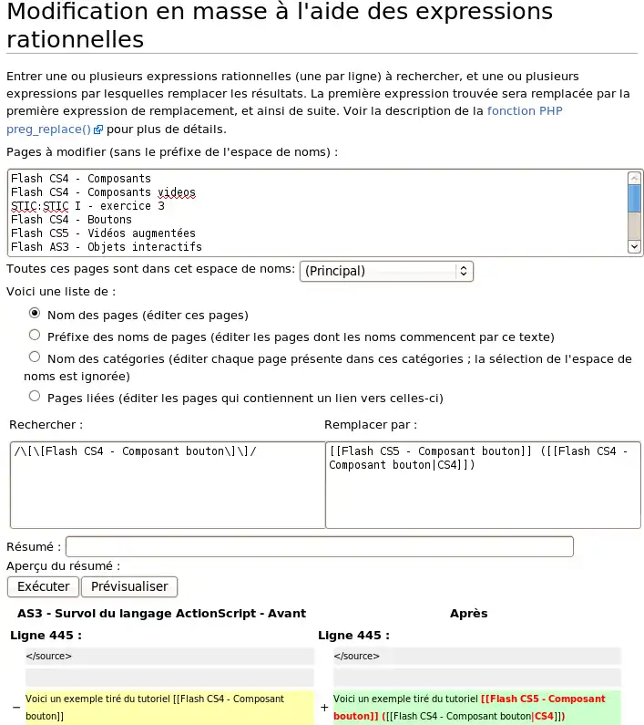Administrators of this wiki can use RegExps to make mass changes to pages.