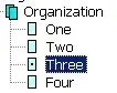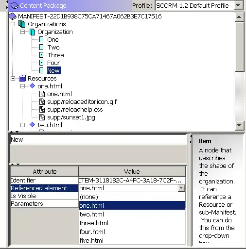 SCO items have a "." in the icon. In the example to the left, this would be item Three. In older Reload Editor versions, one also could see SCORM properties as sub-items. (Daniel K. Schneider doesn't know how to "un-SCO-fy" an item without editing the xmlmanifest.)