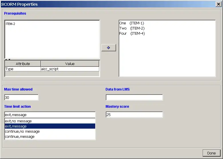 In the SCORM Properties panel that will open you can then define the five kinds of AICC/CMI extentions: Prerequisites, Max time allowed, Time Limit Action, Data from LMS, Mastery Score.