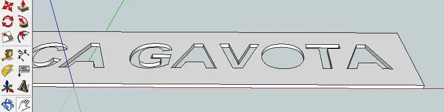 - Push each letter down as explained above. This is a bit tricky, tilt the object (e.g. to a 60 degree angle) and zoom in (else you can't select the letters). Make sure to push util the tools says "on face" !