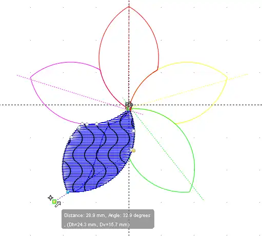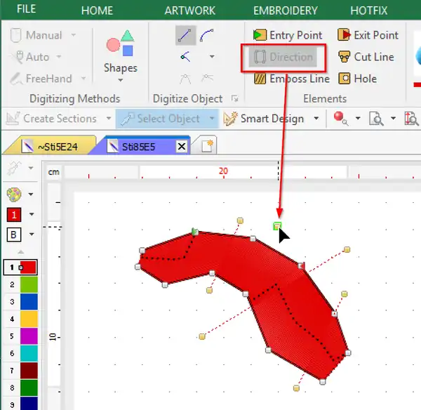 After auto-digitizing some vector graphics art, e.g. through Art to Stitch (Intelligent) or Art to Stitch (Area only) you often would like to change direction of stitches, in particular if you use a fancy area fill pattern. As we shall explain below in some detail, grab the yellow controls of the so-called direction lines and turn. Press down the ALT key before selecting (this will help grabbing the controls). In addition, you can add new direction lines to areas.