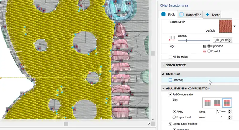 As you can see, by default, Stitch Era added 2mm pull compensation on both sides. It probably would be better to add a percentage or a higher value since the area (yellow butterfly wing from a child's drawing) is rather large.