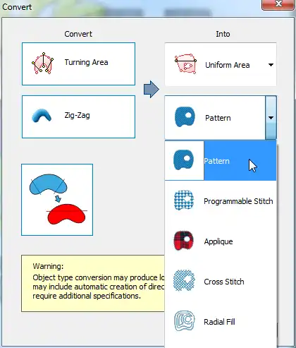 Note: Professional digitizers seem to prefer converting manually each vector to a stitch section or even individual stitches. We show an example of how to do this when we discuss pull/push compensation.