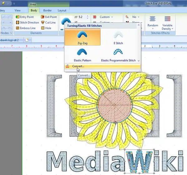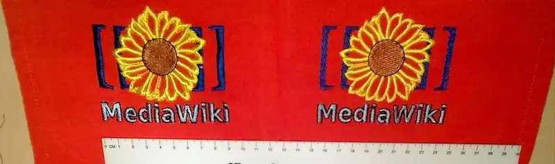 The following example shows are rather large Mediawiki logo. Both the "M" and the "W" had to long stitches, i.e. would produce a somewhat fragile design. The easiest (not the prettiest) way to deal with this is to convert these areas to fill patterns.