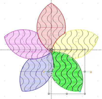 The selected green leave area shows a single horizontal direction line (yellow dots at both ends). You also can see faint lines in other petals, but won't see the yellow controls of course, since you only can edit one object at one time...