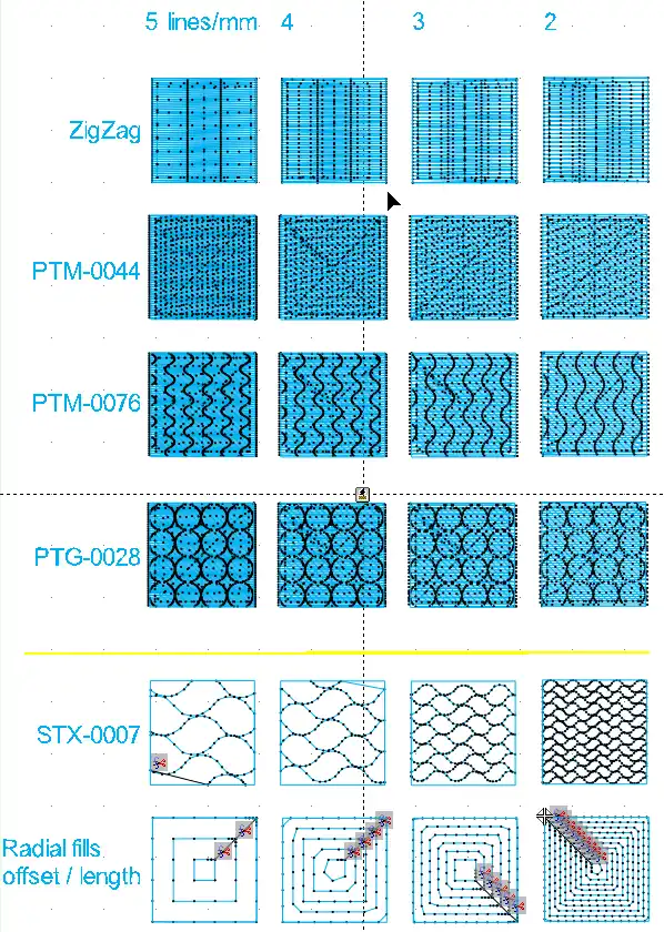 - For the Zigzag and the patterns (four first lines), density changes from 5 lines/mm (bullet proof) to 2 lines/mm (transparent). We also used the ZigZag auto-split feature, else we'd have a single stitch going from one end of the square to the other.