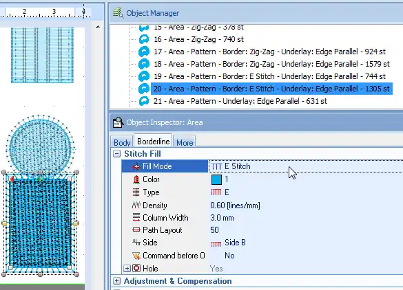 Figures 3 and 4 borders were made with through parametrization which is actually much faster and probably also leads to better results. In the Object Inspect, click on the Borderline tab and then select the kind of border you would like. In the screen shot to the right we show how we configured the E-Stitch that goes inwards (Side B).
