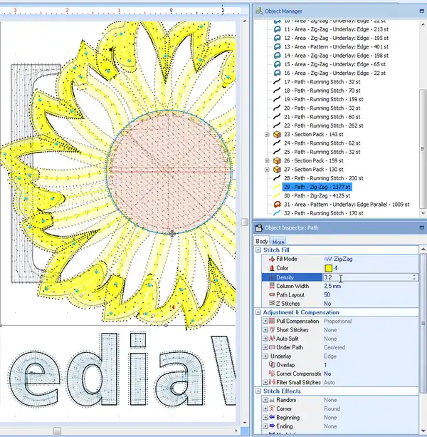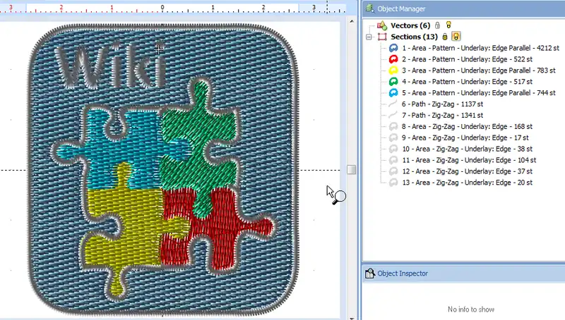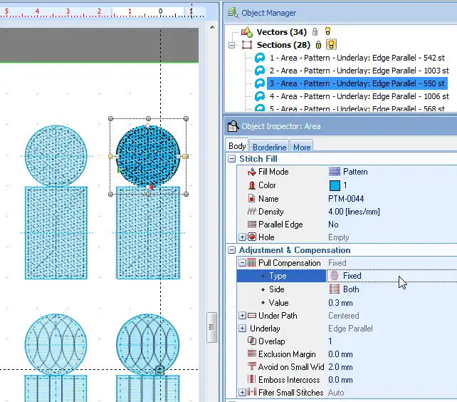 In this section, we will introduce two things: 1) how to deal with "pull", a kind of distortion that is inherent in embroidery. 2) that you should be aware of the object manager and the section inspector. These tools provide an easy way to manage already digitized stitch sections.