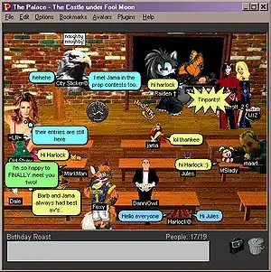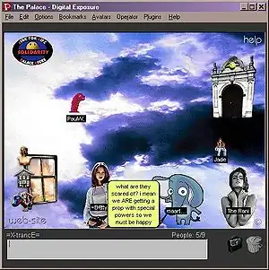 “The Palace is a software program used to access graphical chat room servers, called palaces, in which users may interact with one another using graphical avatars overlaid on a graphical backdrop. The software concept was originally created by Jim Bumgardner, an employee of Time Warner Interactive, in 1994, and was first opened to the public in November 1995.” (Wikipedia, retrieved 19:43, 16 September 2010 (CEST))
