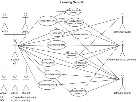 The use case diagram [below] specifies several actors in a learning network: learners, providers and autonomous software agents. A learner can be an individual person or a group of persons. A further specialization of learners can be given in terms of workers, citizen and students (in regular educational institutes). Different kinds of providers may be distinguished, such as content providers responsible for the provision of learning content (e.g. experts, publishers, libraries) and learning service providers can be distinguished, responsible for tutoring, mentoring, assessment and other learning support functions (e.g. schools, universities, training institutes). Software agents can perform a variety of activities in collaboration with the human actors: sometimes they take over some human activity but in most cases they will support the humans in performing their activities.