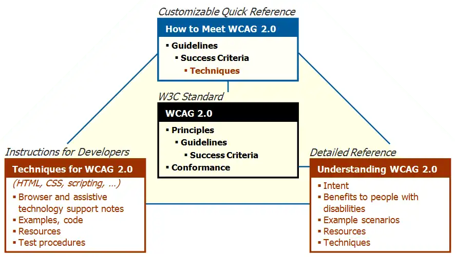 The relationship between these four texts is explained in The WCAG 2.0 Documents and its following figure:
