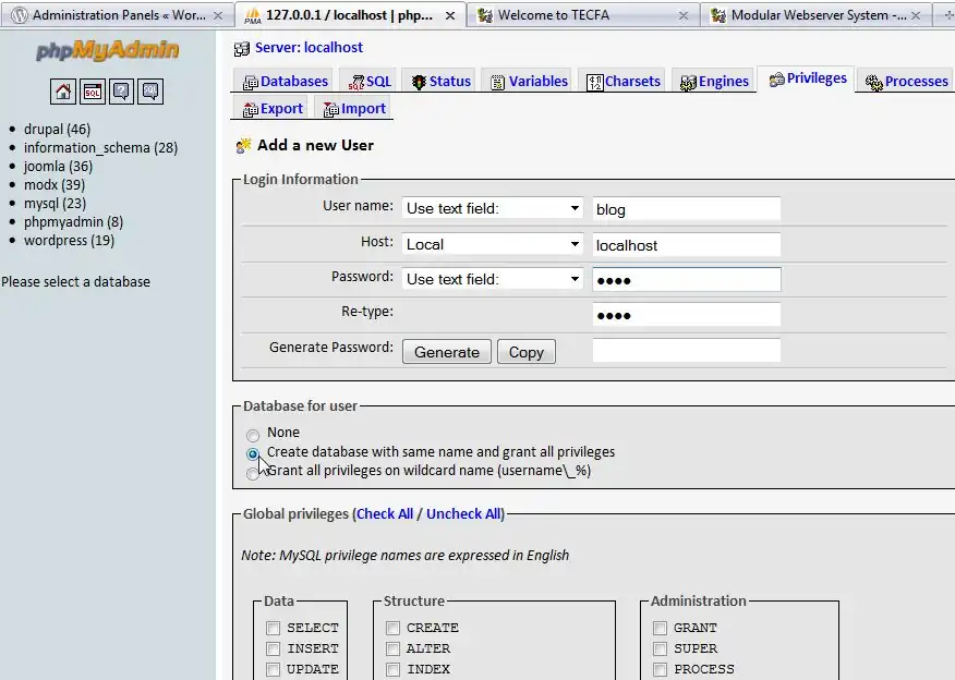 PhpMyAdmin is a popular database management system that is installed with most providers and that you also should install on servers you own. With this web-based administration, you can create a new database and user in different orders. The most easiest way is to use the following procedure: