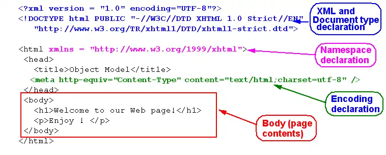 - The root element of the document must contain an xmlns declaration for the XHTML namespace. Examples: