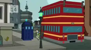 - When the British version of the Planet Express headquarters is first shown, the TARDIS can be seen on the sidewalk, as a double decker hoverbus drops off the Fourth Doctor next to it, who runs inside. This is an obvious reference to the British TV show Doctor Who.