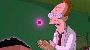 With the crew curious as to why the Professor is so upset about the ordeal, the Professor reveals that while he was working for Mom for the third time (having twice realized how evil she is and vowing never to work for her again), he was experimenting with dark matter which, at the time, was a completely useless substance. Placing several balls in a particle accelerator, the experiment produced a red, glowing energy crystal which turned all dark matter in existence into fuel. He presented it to Mom, who promptly decided to get back together with her ex-husband Wernstrom and took the crystal for herself, firing Farnsworth. Farnsworth adds that, at the same time as the energy crystal, he produced an opposite crystal which he kept hidden from Mom. He explains that if the two crystals should come in close-enough range with each other, their effects on dark matter would negate, rendering dark matter useless and allowing scientists to care enough to produce new fuel, as well as ruining Mom's dark matter empire. However, he now believes the anti-crystal to be lost forever, little realizing that it was found and is currently being used by Cubert and Dwight as a 12-sided die in their Dungeons & Dragons game.