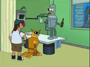 He was briefly sent to an institute for insane robots, along with Fry, who went temporarily insane. He got to go on tour with Beck after becoming paralysed from a freak accident with a can opener, thus fulfilling his dream of becoming a folk-singer, became Pharaoh of an entire planet, driving everyone (including Fry and Leela) into slavery, and beat Elzar on the television show Iron Cook. However, he did not accept the title of Iron Cook, only the lesser title of Zinc Saucier (which he made up, and comes with double prize money).