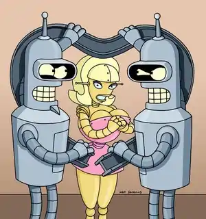Bender then concocts a convoluted plan to catch Angle-ine cheating on him with... him (wearing a fake beard that looks like Flexo's). He calls her to set up the meeting, and then goes to The Hip Joint. He orders them drinks, and pays with the money he earned scabbing. However, the Robot Mafia sees this and is almost infuriated. Bender insults himself in order to pull off the con, but it doesn't work immediately. He takes her out on the dancefloor, and pays the DJ to play his request. The Robot Mafia sees this and is one step closer to attacking him. While dancing, Bender's fake beard comes off, and although he is almost caught, he dips Angle-ine to distract her. The robots in the club start dancing so furiously that their parts begin to fall off.