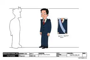 - Matt Tobey (14 May 2012). Countdown to Futurama: Senator Chris Travers. (Comedy Centrl.) Retrieved on 14 May 2012.