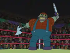 The Clearcutter is a member of the Ultimate Robot Fighting League and lost in a fight against Bender because he wasn't as popular. He also cut down an entire forest which worried people because it could harm Bigfoot.