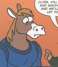 Clyde is a horse-like former employee of Planet Express. He was fired from his position for failing an annual physical examination due to a case of hoof and mouth disease. He also appears to be a racer, as Bender had placed a bet on him.