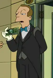 The Crack Mansion Butler is a butler that works at the very-upscale Crack Mansion. When the Crack Addict gets his $300 rebate by Richard Nixon's head, he decides that he won't go any more cheap crack houses, and quickly blows his $300 by giving all of it to the Crack Mansion Butler.