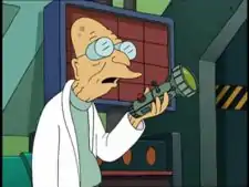 Professor Farnsworth holding the F-ray in the year 3000. [1ACV13]