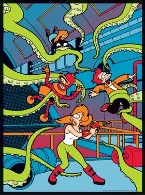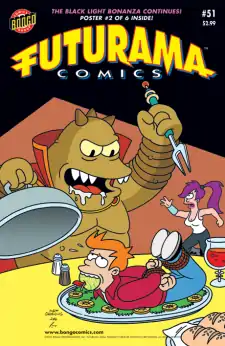 • According to the promotional blurb "this issue features the second of six awesome Futurama posters, suitable for unfolding." Like the previous issue's poster, it is a black light poster. The poster is a recoloured variant of the cover of Futurama Adventures.