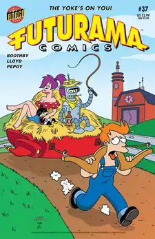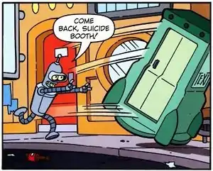 - In the panel where Bender is chasing a Suicide Booth, on the side of the suicide booth it has the word "text" written on it, this was possibly written there temporarily to be replaced later on but was never changed.