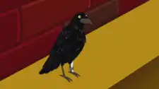 A raven in the Planet Express employee lounge. [7ACV08] The raven is carrying a piece of paper — a reference to the messenger ravens in Game of Thrones.