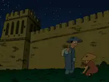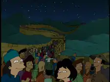 In 3001, Fry and Bender flew the ship, hooked to the Planet Express building with the professor's grandmother's unbreakable diamond tether, over the Great Wall of China, [2ACV19] causing the building to hit the Wall and destroy it, allowing Mongolian cavalrymen to move further into the country.