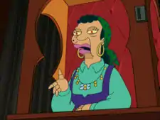 The gypsy is a fembot who offers to use her psychic abilities for money, which she constantly demands. It is unknown whether she is a fake since she was able to tell Bender was a Were-Car just by looking at him and explains that he will kill his best friend, [2ACV18] though when Bender was floating in space she obviously faked communicating to Fry from him. [3ACV20] She carries a read-me file of Curse of the Were-Car and a ray gun. While her head exploded due to Bender's haunting in 3011, she presumably survived, as have several other characters who had their heads blown up. [6ACV19]