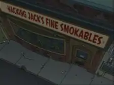 Hacking Jack's Fine Smokables is a tobacconist, selling many smoking brands, owned by Hacking Jack. The store owned a unique cigar known as "Le Grand Cigar", which was priced at 10000 dollars, until it was stolen by Bender.