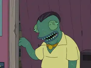 The human-horn dealer is a chameleon-like sleazy alien who owns the Beast With Two Bucks sex shop at the Galactic Bazaar. He sells many porn products, including human horn (though he doesn't allow cops inside the shop). He video-tapes everyone who comes in, so that he can blackmail them later. In 3004, he owned Fry's nose, which he sold to Lrrr.[4ACV17]