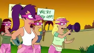 At the construction site, a group of environmentalist feminists, the Feministas, lead by Frida Waterfall, shows up to protest the construction. To show his appreciation, Leo blows them up, and Frida's female symbol pendant becomes lodged in Fry's brain.