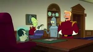 The Feministas are sentenced to Maxi-Padlock, a high security women's prison. And with the group gone, Leo schedules the demolition for the next day. Fry is unsure what to do, so he seeks out the Legion again. The Number 9 Man explains that Fry has to stop the Dark One from stopping him stopping Leo Wong, and in order to do that, he needs the Omega Device. The device, when activated, will momentarily disable the Dark One, giving Fry a chance to stop it. However, to recognize the Dark One, Fry has to come up with a plan himself, Hutch explains that its thoughts are unreadable, which gives Fry an idea.