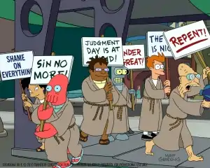 In New New York, Farnsworth's plan goes under way to convince people to be more decent, but it takes the form of a "The End Is Near" protest, which is easily dismissed as crazy. They see Sal attempting to pay five dollars for a night with Petunia, who announces she could go for just three dollars, much to Sal's disgust, and thus goes into the Pubic Library (and not public library as Fry thought).
