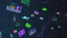 When Leela and Zapp travel through the V-GINY (a massive censoring module), the viewer can see tens of screens with different shows, including many commercials and shows previously seen in the Futurama universe.