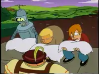 "My Three Suns" 1 After escaping into the castle, two guards appear. Fry sprays them with water, and Bender afterwards helps with the clogged drain and he wants 150 dollars for it. Addition