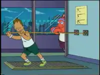 2 During Zoidberg's trip to the gymnasium, he cuts the rubber cords on the exercise machine Larry (Mom's son) is using and he flies through the window. Addition